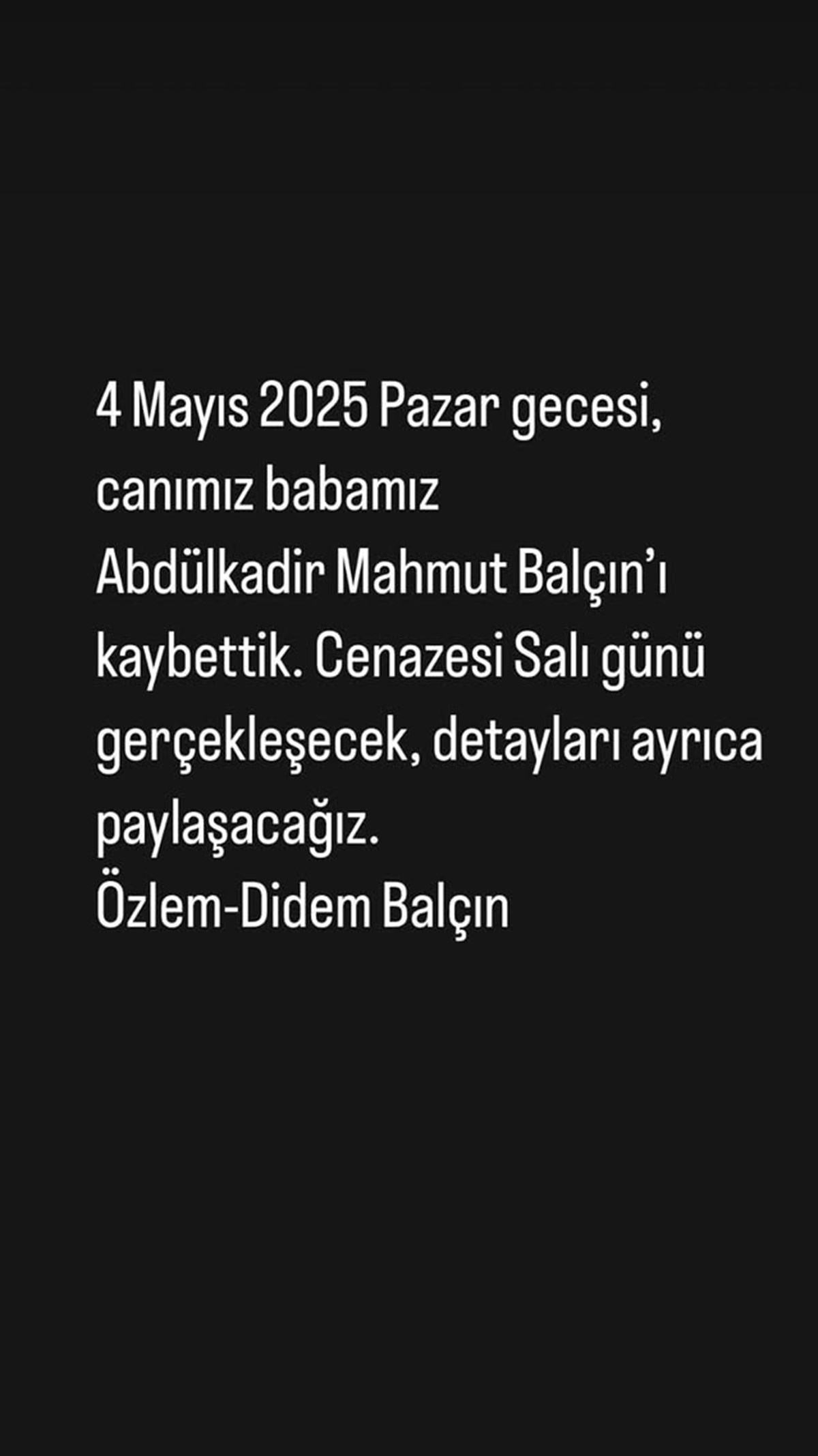 Ünlü oyuncu Didem Balçın, babası Abdülkadir Mahmut Balçın’ın hayatını kaybettiğini duyurdu.