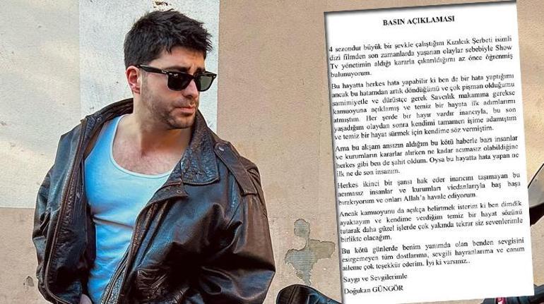 ”4 sezondur büyük bir şevkle çalıştığım Kızılcık Şerbeti isimli dizi filmden son zamanlarda yaşanan olaylar sebebiyle yönetimin aldığı kararla çıkarıldığımı az önce öğrenmiş bulunuyorum. Bu hayatta herkes hata yapabilir ki ben de bir hata yaptığımı ancak bu hatamdan artık döndüğümü ve çok pişman olduğumu samimiyetle ve dürüstçe gerek savcılık makamına gerekse kamuoyuna açıklamış ve temiz bir hayata ilk adımlarımı atmıştım. Her şerde bir hayır vardır inancıyla, bu son yaşadığım olaydan sonra kendimi tamamen işime adamıştım ve temiz bir hayat sürmek için kendime söz vermiştim. Oysa bu hayatta hata yapan ne ilk ne de son insanım. Kamuoyunu da açıkça belirtmek isterim ki ben dimdik ayaktayım ve kendime verdiğim temiz bir hayat sözünü tutarak daha güzel işlerde çok yakında tekrar siz sevenlerimle birlikte olacağım. Bu kötü günlerde benim yanımda olan benden sevgisini esirgemeyen tüm dostlarıma, sevgili hayranlarıma ve canım aileme çok teşekkür ederim. İyi ki varsınız”